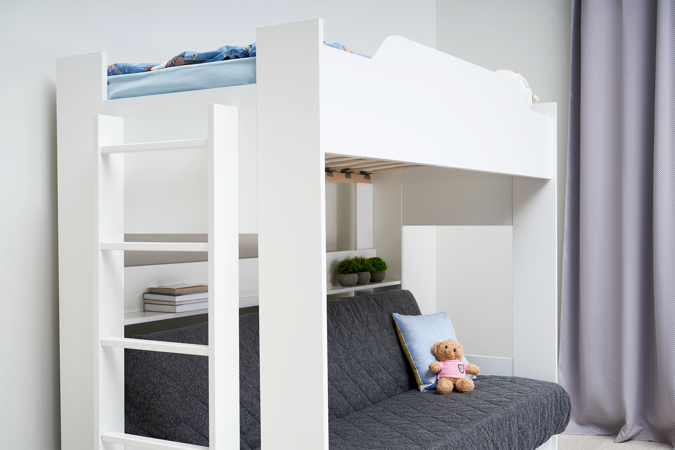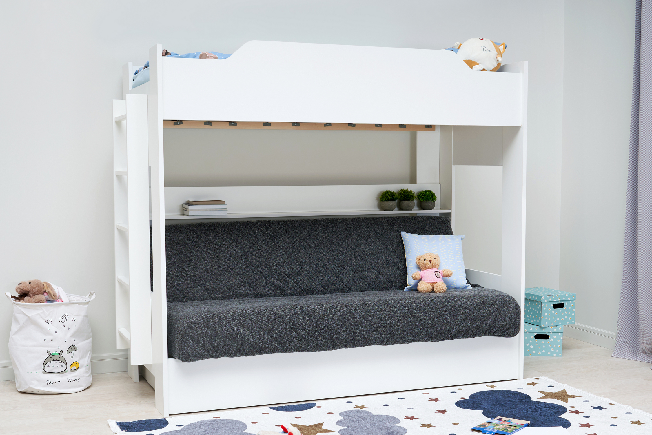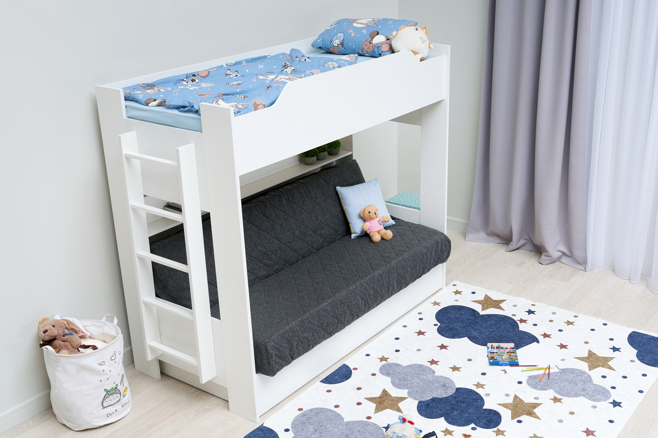 Механизм трансформации дивана: «Книжка». Рекомендуемая высота матраса на верхний ярус 17 см. Максимальная нагрузка на верхний ярус 50 кг. Лестница может быть установлена с обеих сторон кровати. Высота бортика 30 см. Максимальная нагрузка на нижний ярус 90 кг. Чехол съемный.