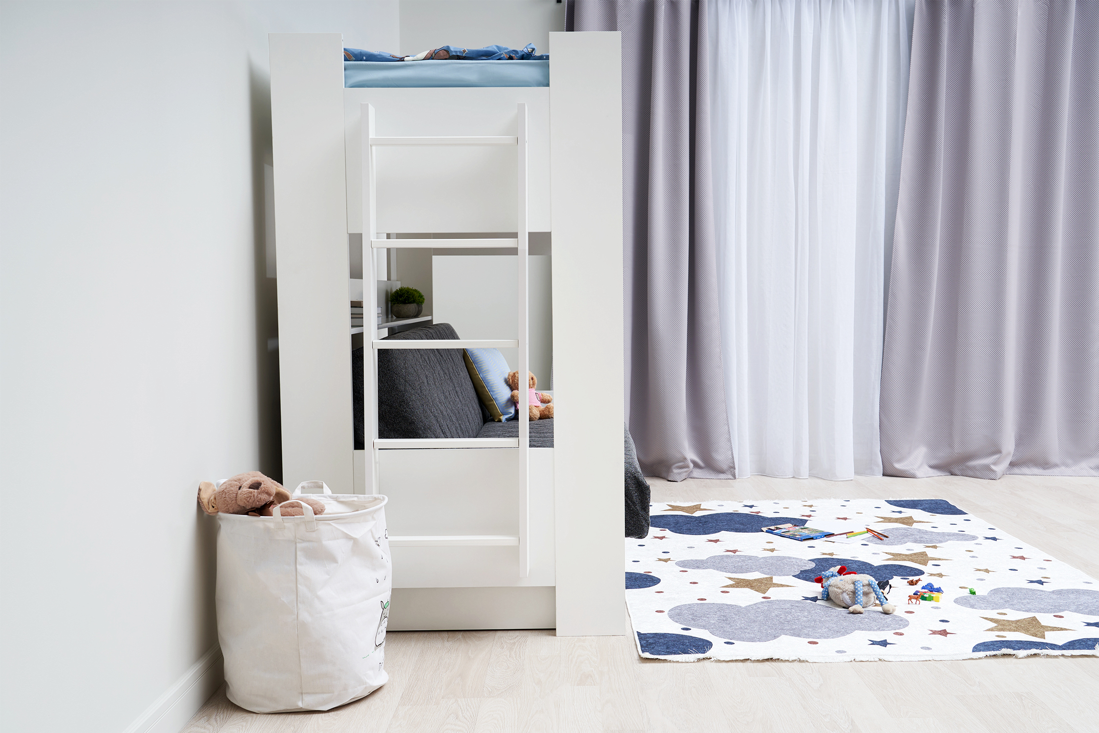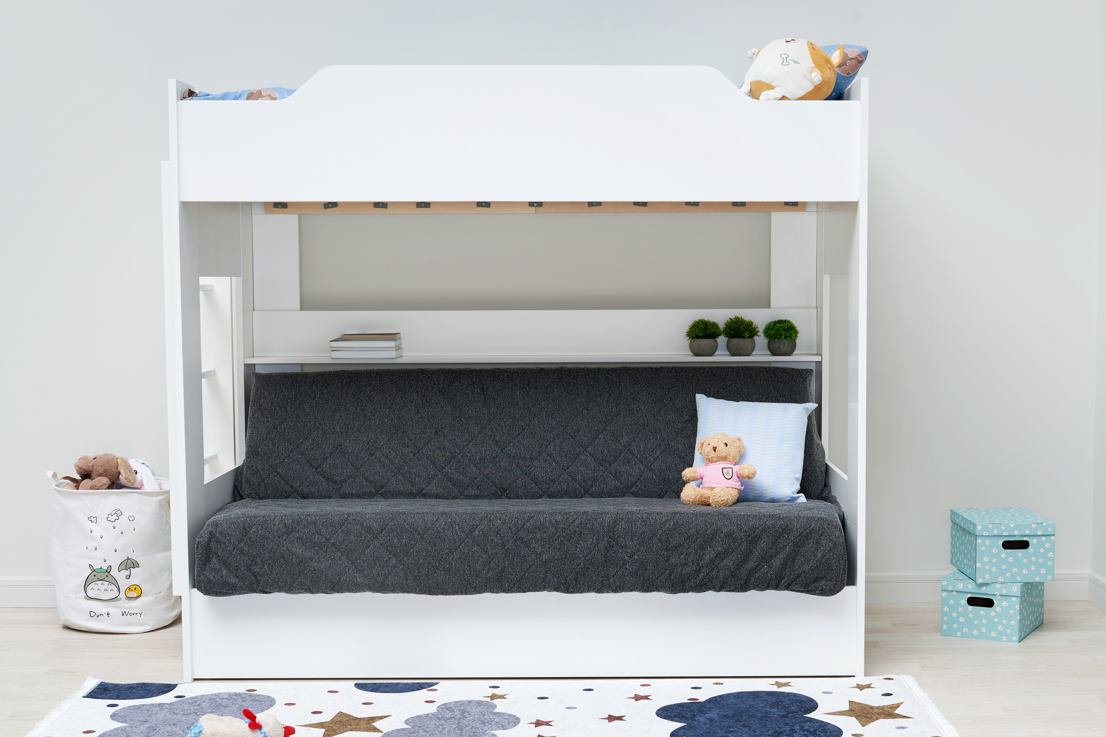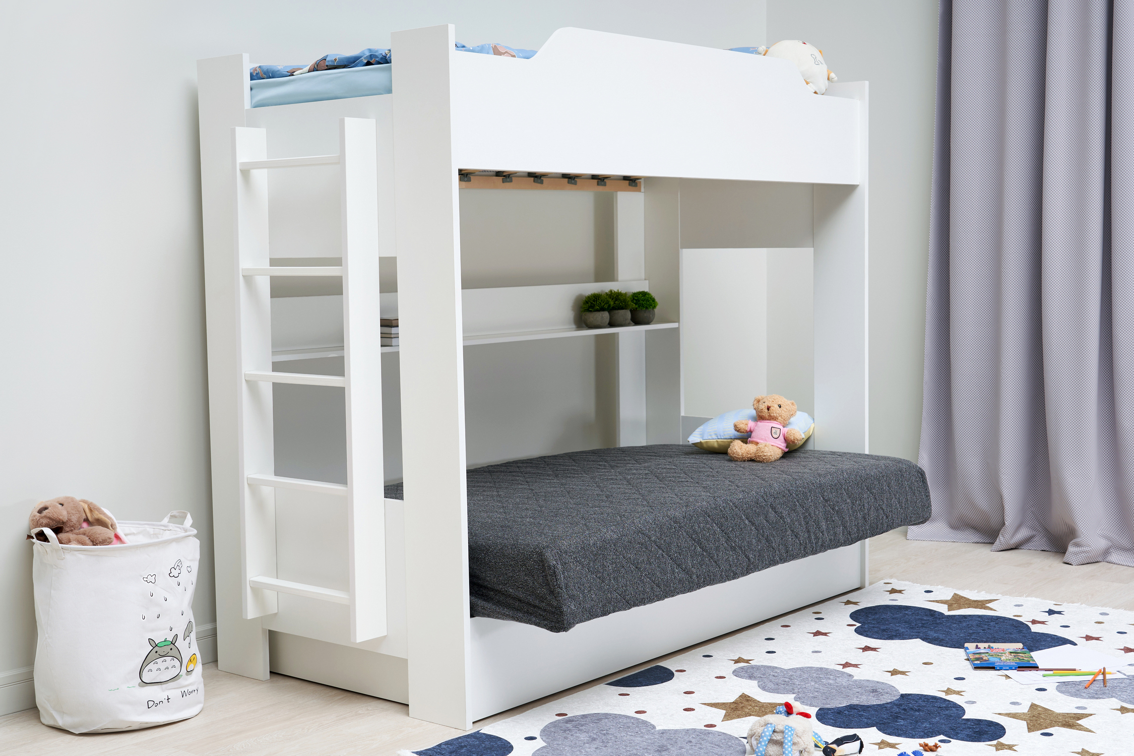 Механизм трансформации дивана: «Книжка». Рекомендуемая высота матраса на верхний ярус 17 см. Максимальная нагрузка на верхний ярус 50 кг. Лестница может быть установлена с обеих сторон кровати. Высота бортика 30 см. Максимальная нагрузка на нижний ярус 90 кг. Чехол съемный.